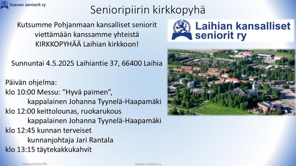 laihia@senioriyhdistys.fi tai puhelimella Riitta Keto 050-3672088, Hanna Ala 050-3810817